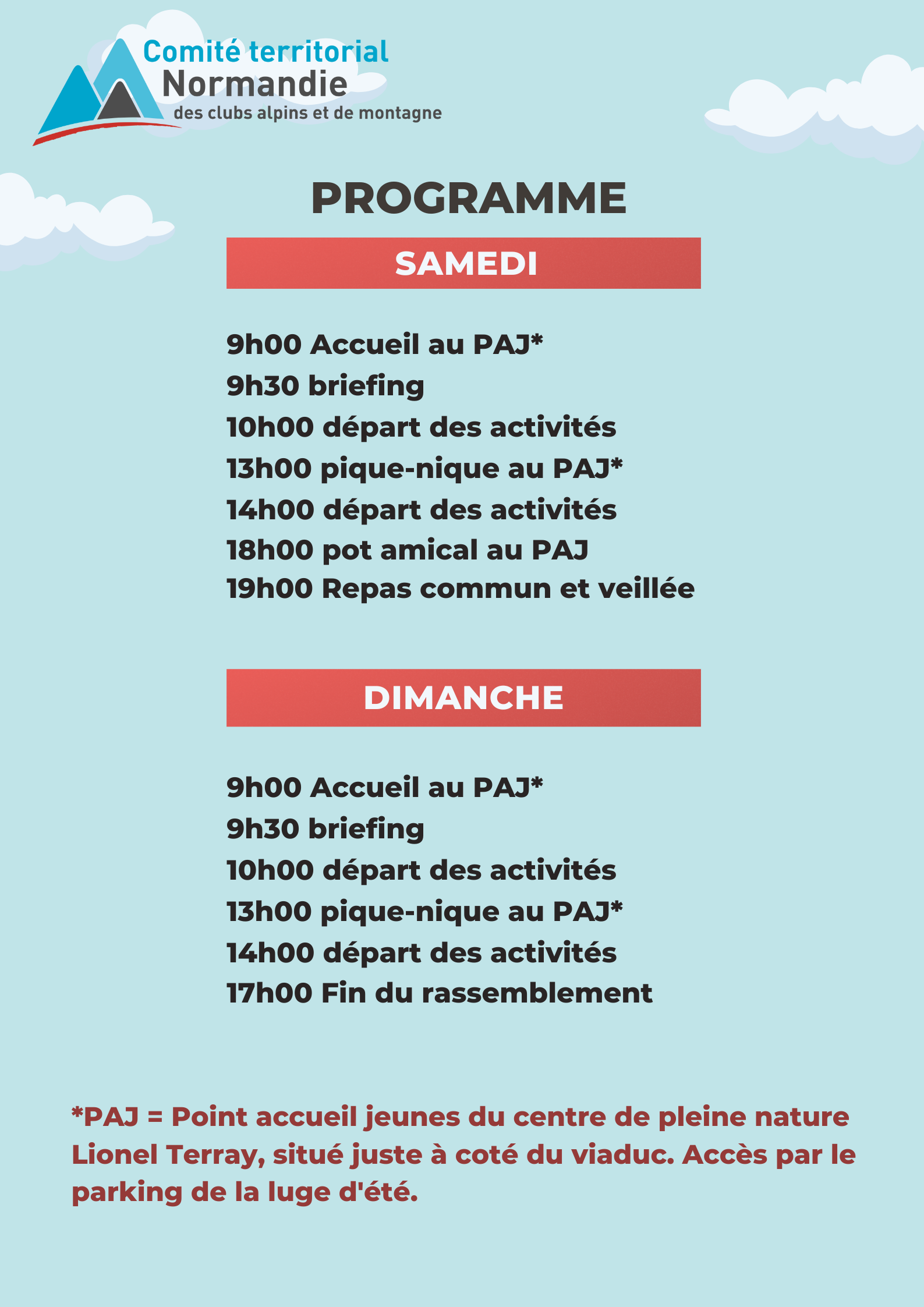 Le point accueil jeunes (PAJ) de la base Lionel Terray (camping situé à coté du viaduc) est réservé. Nous l'utiliserons comme point de rassemblement pour l'accueil, les piques-nique, le repas commun du samedi soir et comme camping pour celles et ceux qui le souhaitent.